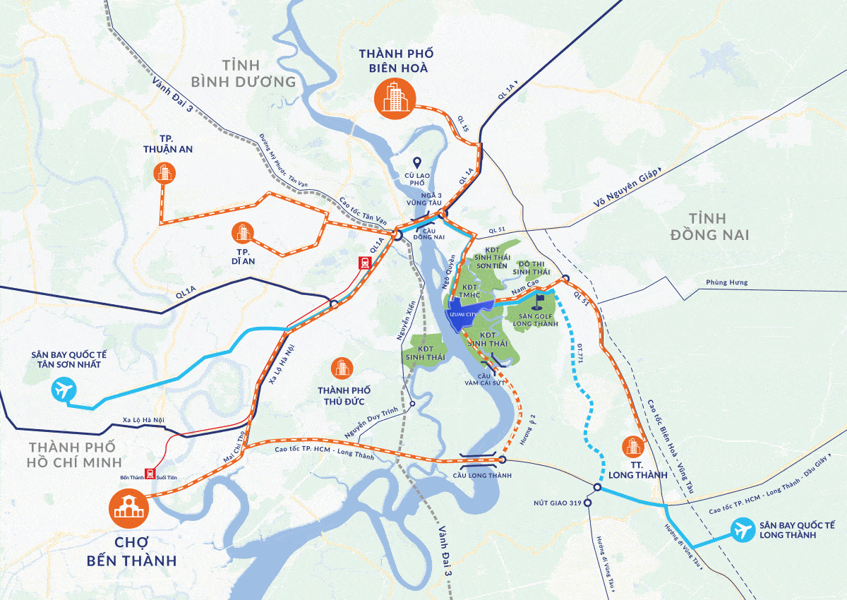 Izumi City sở hữu lợi thế mặt tiền hai tuyến đường chính Hương lộ 2 và Nam Cao lộ giới 60m với 10 -12 làn xe nằm ven sông Đồng Nai.